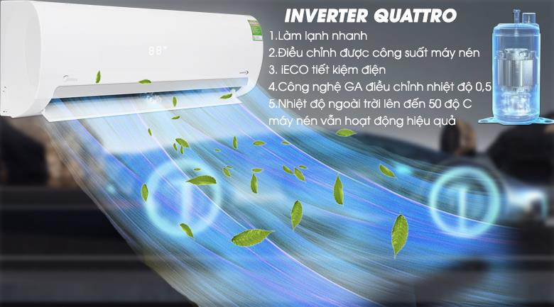 Được trang bị công nghệ tiết kiệm điện Inverter Quattro thì máy đem lại khả năng tiết kiệm điện, làm lạnh sâu, vận hành bền bỉ vượt trội hơn so với những máy lạnh thường.