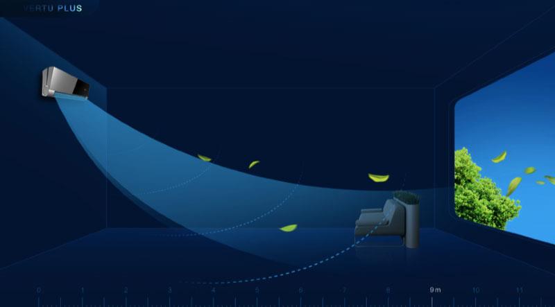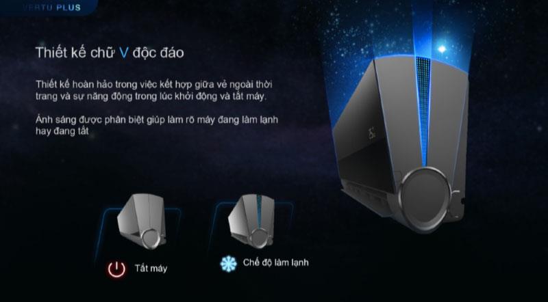 Thiết kế chữ V độc đáo giúp hạn chế độ rộng tối đa, luồng không khí thổi ra sẽ thông suốt hơn, khiến cho khoảng cách gió thổi ra sẽ xa hơn lên đến 9m. Ngoài ra, thiết kế này cũng giúp máy hoạt động êm ái hơn, độ ồn đo được ở mức làm lạnh dễ chịu là 24.5 dB (tương đương không gian yên tĩnh khi đọc sách trong thư viện).