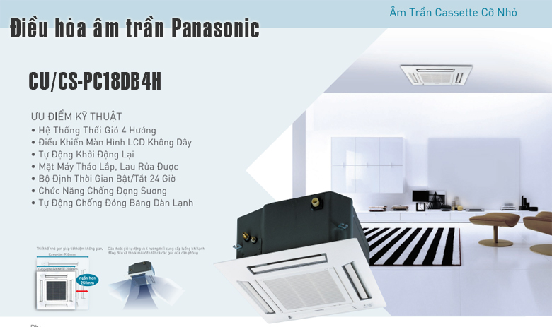 Với công suất điều hòa âm trần 18.000BTU, Panasonic CU/CS-PC18DB4H lựa chọn lắp đặt lý tưởng cho phòng có diện tích dưới 30m2: Phòng ngủ, Phòng khách, showroom thời trang, nhà hàng....