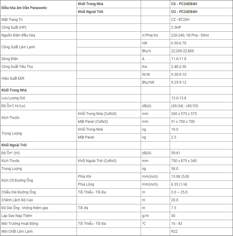 Giá điều hòa âm trần Panasonic CS-PC24DB4H hấp dẫn hơn nhiều so với model Panasonic S-25PU1H5/U-25PV1H5 gas R410a, Panasonic S-25PU1H5B/U-25PN1H5 và đối thủ Daikin FCNQ26MV1/RNQ26MV19.