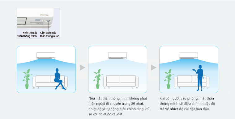 Mắt thần thông minh: Mắt thần thông minh sẽ ngăn hao phí điện năng bằng cách sử dụng cảm biến hồng ngoại phát hiện những chuyển động của người trong phòng để tự điều chỉnh.
