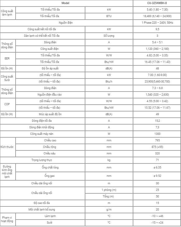 Điều hoà multi Panasonic CU-3Z54WBH-8 chỉ với 1 dàn nóng có thể kết nối tối đa tới 3 dàn lạnh (3 phòng) với nhiều loại dàn khác nhau (Dàn lạnh điều hòa multi âm trần, âm trần nối ống gió, và treo tường) phù hợp với mọi không gian nội thất công trình của bạn.