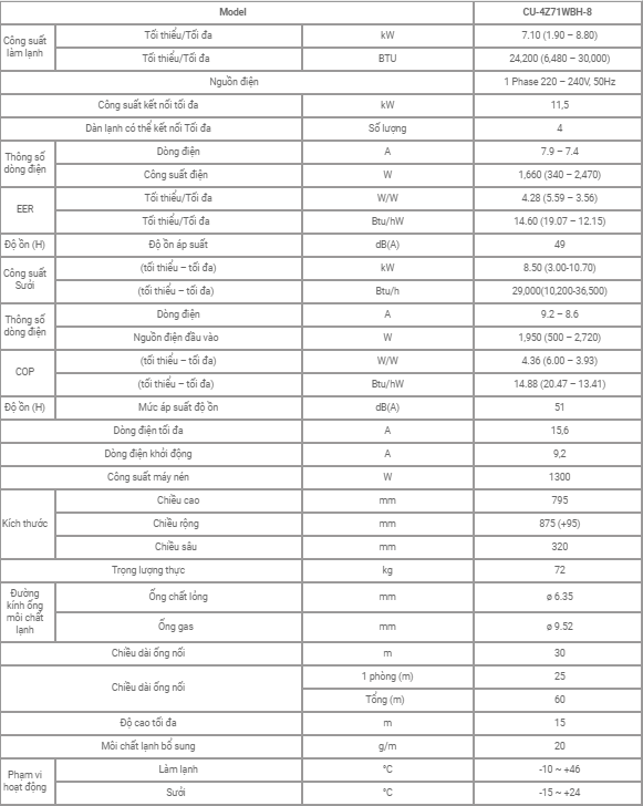 Điều hoà multi Panasonic CU-4Z71WBH-8 chỉ với 1 dàn nóng có thể kết nối tối đa tới 4 dàn lạnh (4 phòng) với nhiều loại dàn khác nhau (Dàn lạnh điều hòa multi âm trần, âm trần nối ống gió, và treo tường) phù hợp với mọi không gian nội thất công trình của bạn.