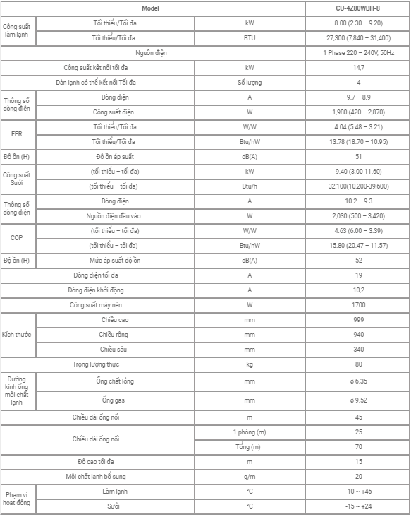 Hơn nữa: Điều hòa multi 2 chiều inverter Panasonic CU-4Z80WBH-8 kết nối tới 4 dàn lạnh nhưng chỉ với duy nhất 1 dàn nóng nhờ đó giúp tiết kiệm thời gian lắp đặt & chi phí bảo dưỡng vệ sinh đình kỳ hàng năm.