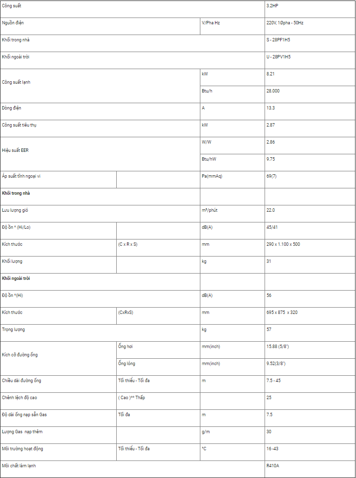 Với công suất 28.000BTU, Điều hòa giấu trần Panasonic S-28PF1H5 phù hợp lắp đặt cho căn phòng diện tích dưới 50m2: Phòng ngủ lớn, phòng khách ...