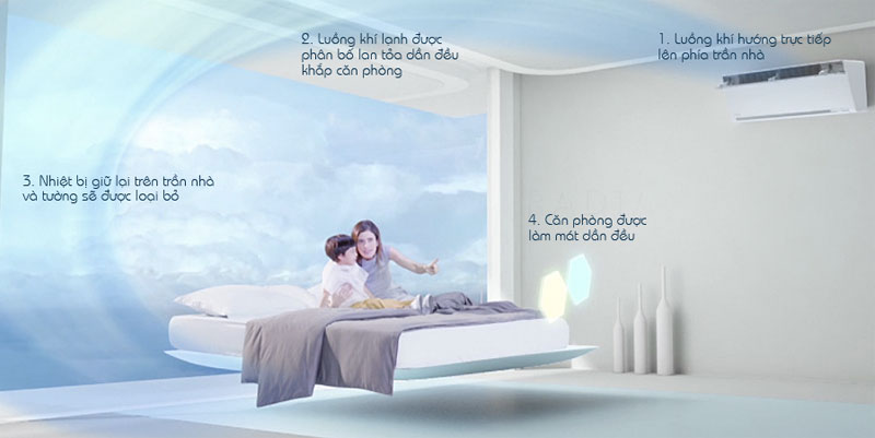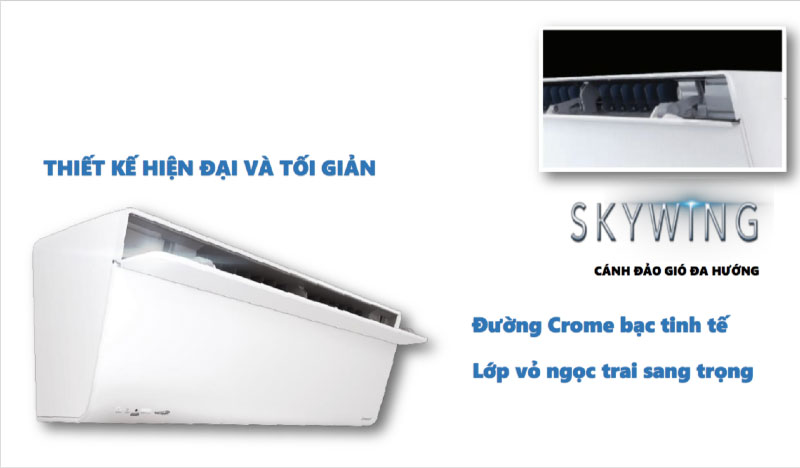 Điểm đặc biệt của dòng điều hòa này là cánh đảo gió Skywing được đặt ở phía trên, lợi ích của thiết kế này là hơi lạnh sẽ đi dọc theo trần nhà rồi đến các bức tường, hơi lạnh có xu hướng đọng xuống và hơi nóng nhẹ hơn sẽ bay lên, do đó khi bạn ngồi trong phòng sẽ có cảm giác mát lạnh dễ chịu thoải mái, hạn chế việc bị khô da.