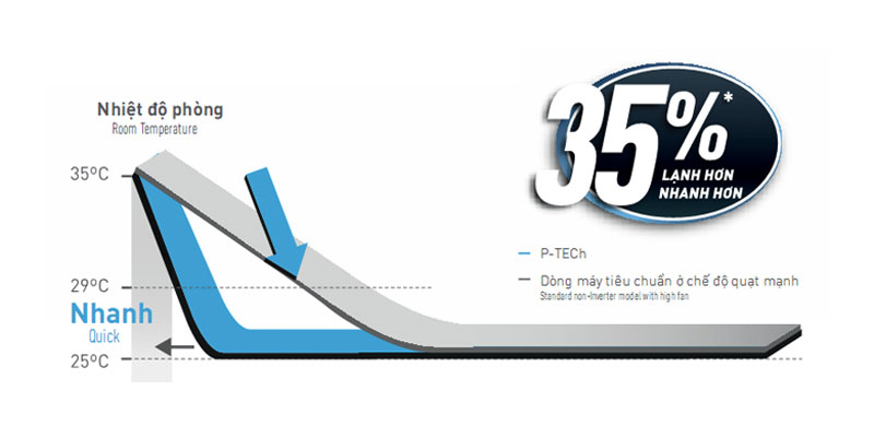 Công nghệ P-TECh giúp Panasonic 2 HP CU/CS-VU18UKH-8 làm lạnh nhanh và mạnh mẽ trong tức thời. Với một nút nhấn iAuto-X trên remote, máy nén sẽ đạt tần số tối đa ngay khi vừa hoạt động nhanh chóng đạt đến nhiệt độ cần thiết nhanh hơn 35% so với những sản phẩm của Panasonic không có công nghệ này. Khi đã đạt nhiệt độ ổn định máy nén sẽ trở về lại trạng thái hoạt động bình thường.