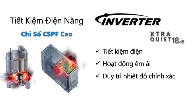 - Công nghệ Inverter làm lạnh ổn định, vận hành êm ái