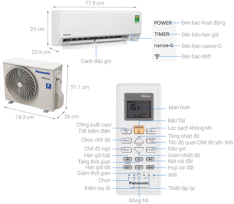 - Thông tin dàn lạnh: Dài 77.9 cm - Cao 29 cm - Dày 20.9 cm - Nặng 8 kg