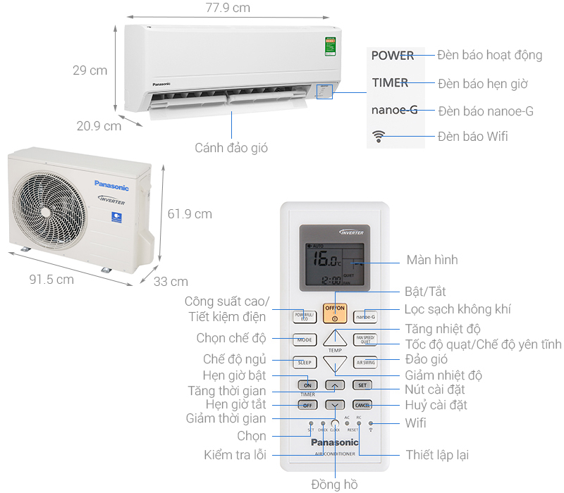 - Thông tin dàn lạnh: Dài 77.9 cm - Cao 29 cm - Dày 20.9 cm - Nặng 8 kg