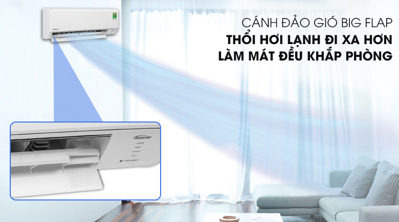 Thiết kế của cánh đảo gió Big Flap có chiều rộng đến 79mm, lớn hơn rất nhiều so với cánh đảo gió ở các máy lạnh thông thường, nhờ vào kích thước cánh đảo gió lớn nên luồng gió thổi ra xa hơn, làm mát đều khắp phòng.